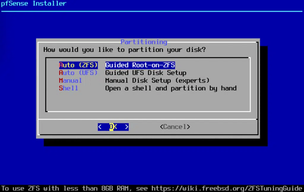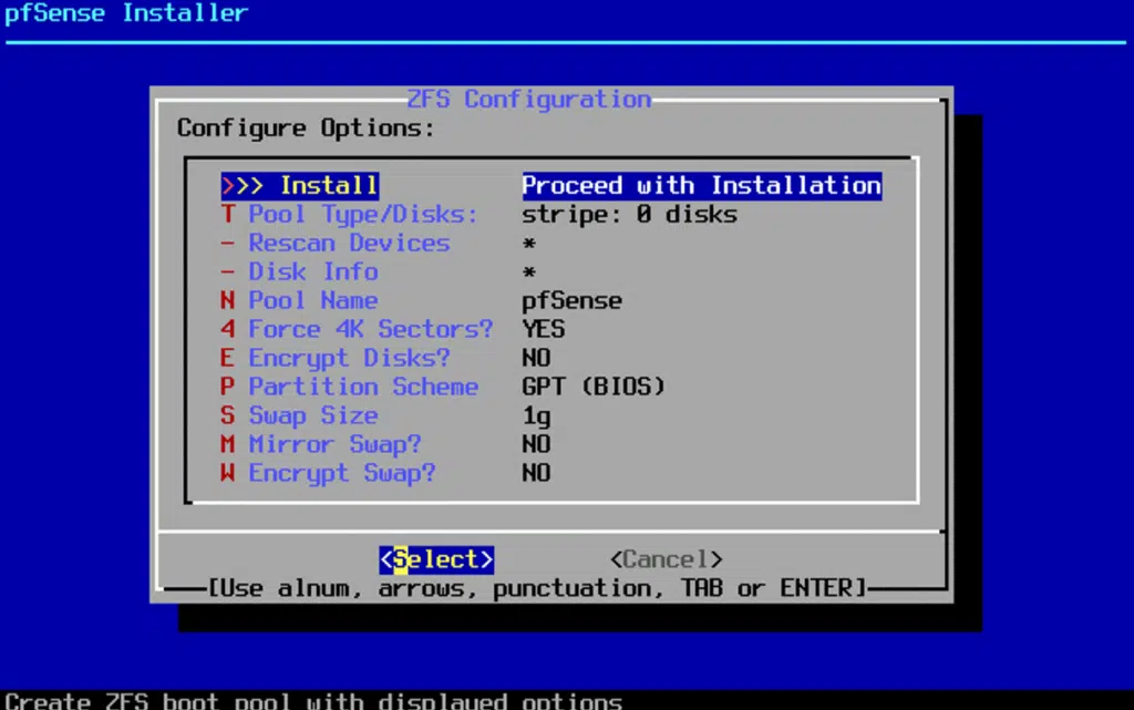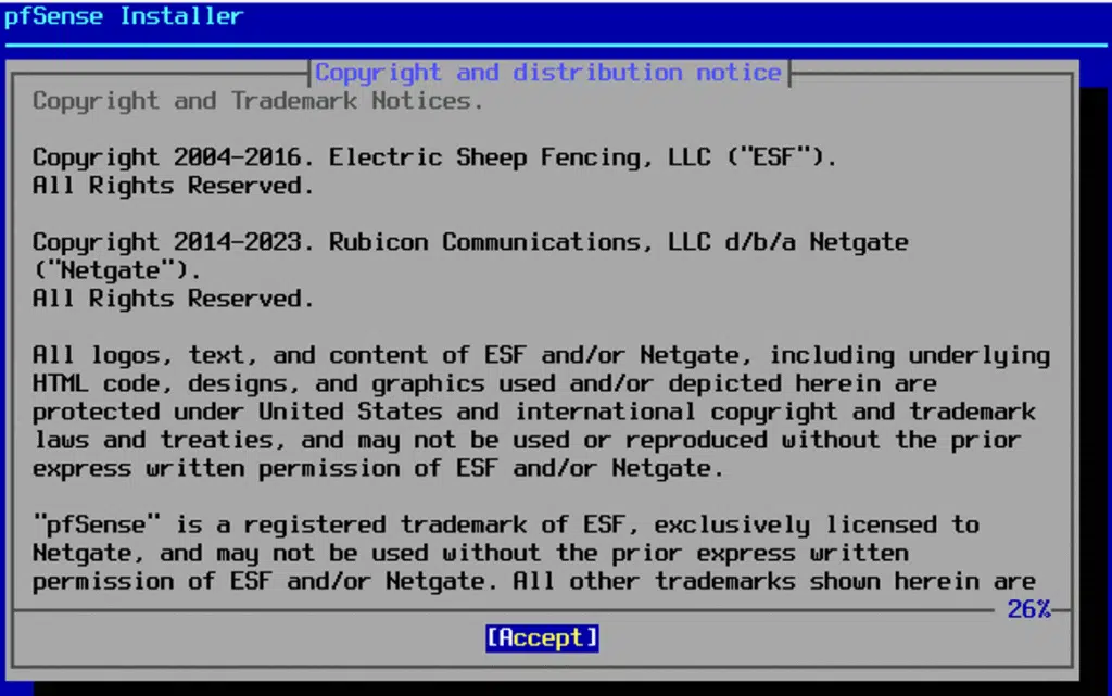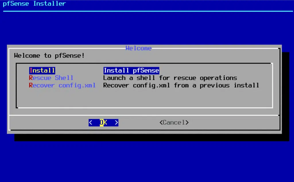 The pfSense installation process is rather straightforward but requires you pay attention to the network interface assignment. I added both of the adapters to the VM before assigning them in pfSense since I had a general idea of which order they would be presented to me, but you can certainly add one by one to be sure you configure the right one at any given moment.
