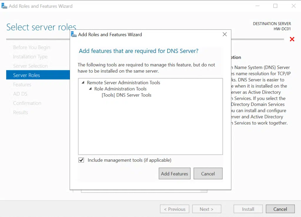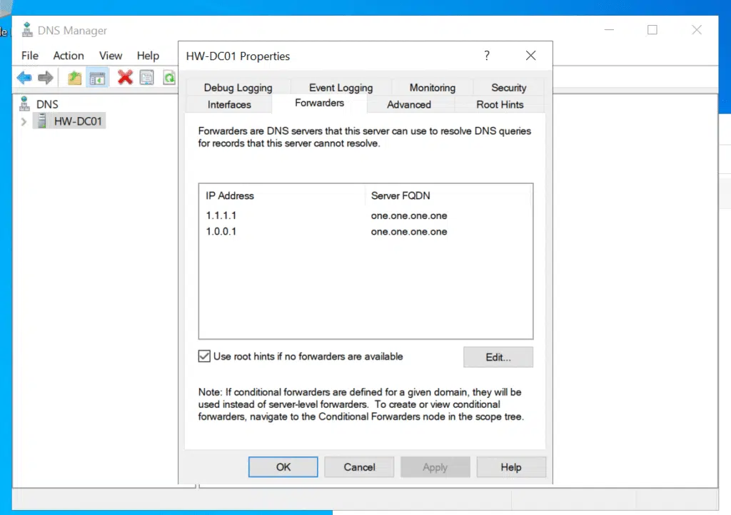 The DNS servers I set to Cloudflare’s public DNS (1.1.1.1 and 1.0.0.1) for now. I knew that when I promoted the server to a domain controller later, these would automatically become DNS forwarders while the server itself became the primary DNS server – exactly what we want to happen.