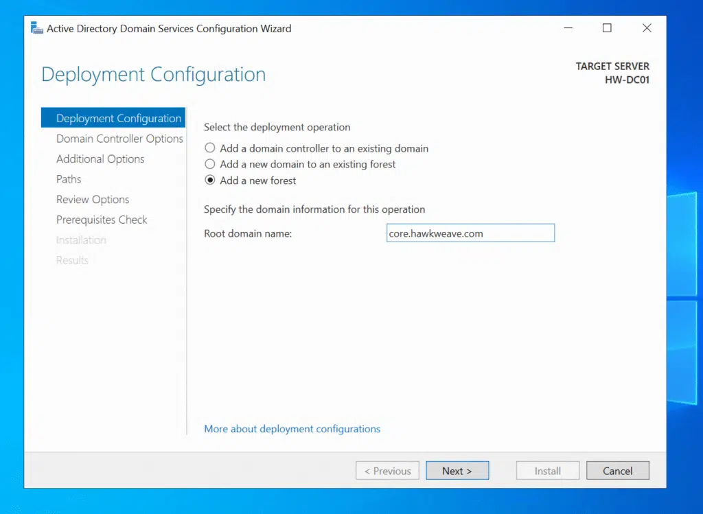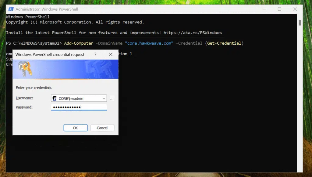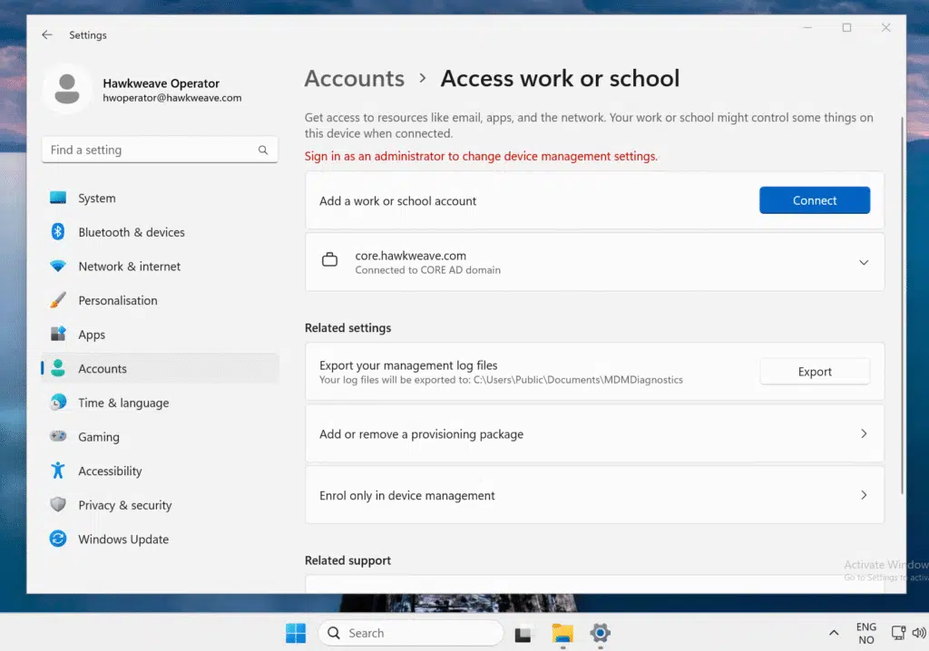 After a reboot, we can see we are joined to the CORE Hawkweave Domain: