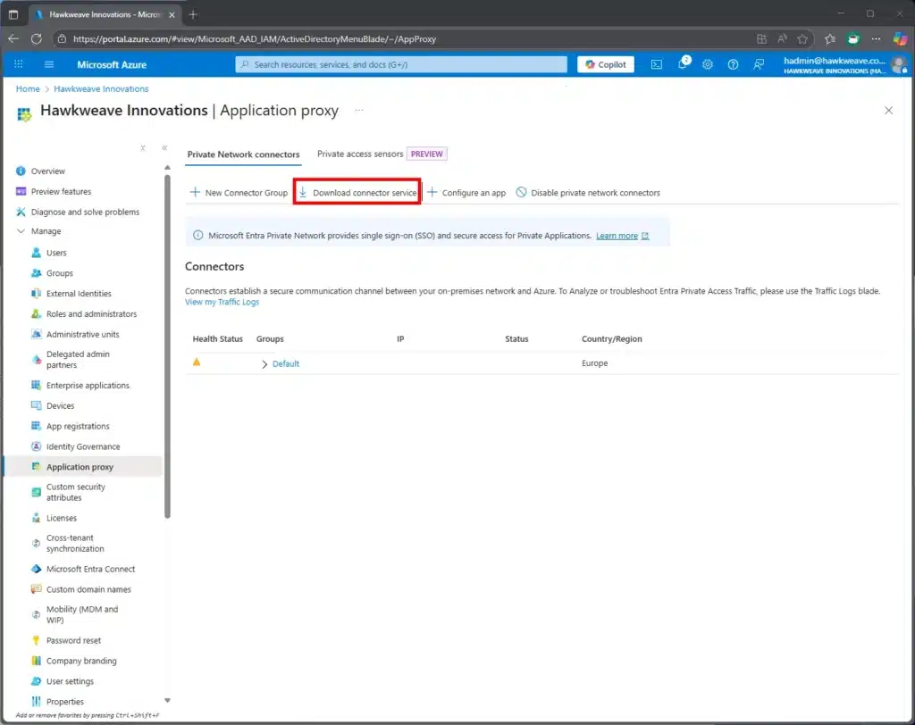 You could also do this via the Microsoft Entra admin center if you prefer, and click Enterprise apps → Private Network connectors → and then Download connector service from there.