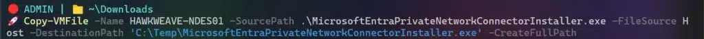 Copy-VMFile -Name HAWKWEAVE-NDES01 -SourcePath .\MicrosoftEntraPrivateNetworkConnectorInstaller.exe -FileSource Host -DestinationPath 'C:\Temp\MicrosoftEntraPrivateNetworkConnectorInstaller.exe' -CreateFullPath
