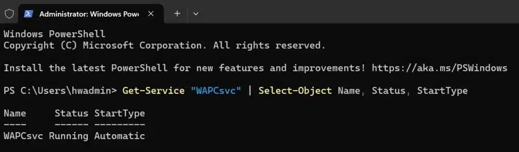Get-Service "WAPCsvc" | Select-Object Name, Status, StartType