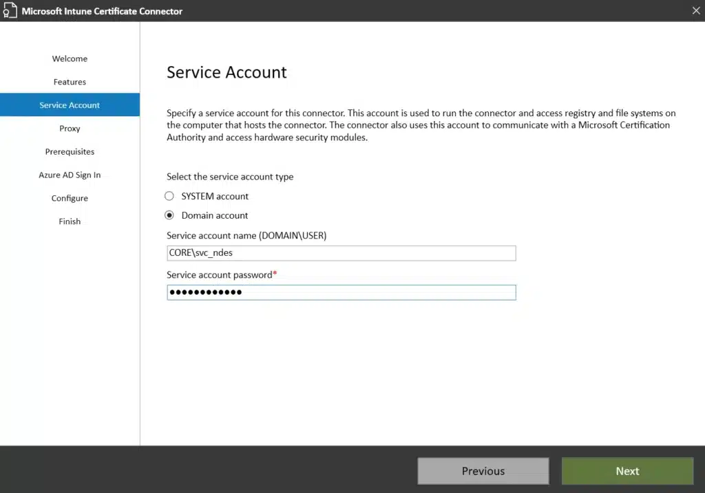 - When prompted for the Service Account, enter the credentials we created in Part 2 (or equivalent for your environment)