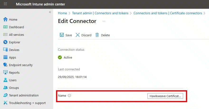 After the installation is done, you will be able to view the connector installed in Microsoft Intune, with a generic name as well as the date stamp of first connection.