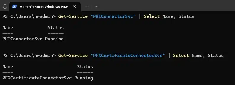 Get-Service "PFXCertificateConnectorSvc" | Select Name, Status
