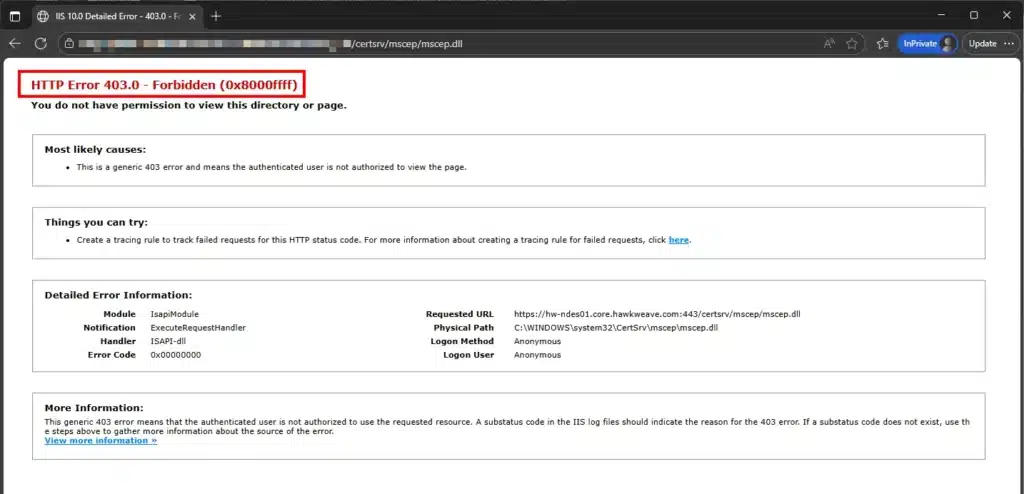 Both tests should return “HTTP Error 403.0 – Forbidden”. This is expected behavior – the NDES server now only accepts certificate requests that include a valid challenge blob generated by Intune. Direct access to the NDES URL is intentionally blocked to prevent unauthorized certificate enrollment.
