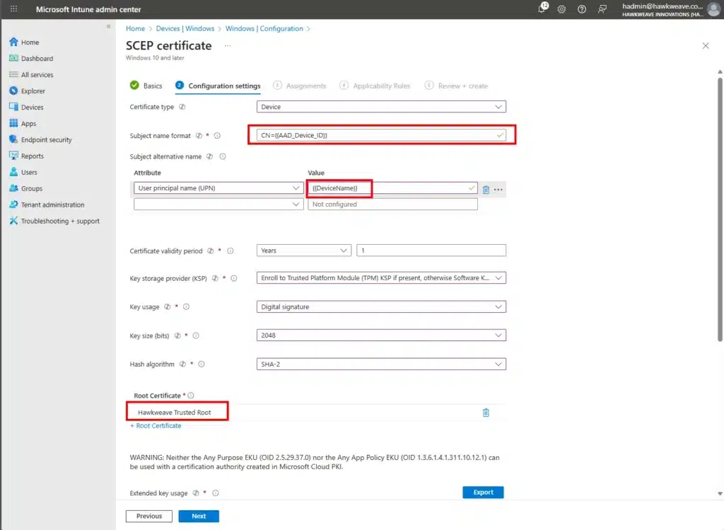 For the Subject alternative name, I chose UPN as the default attribute and populated it with the DeviceName, but you might find DNS a more useful attribute in your environment.