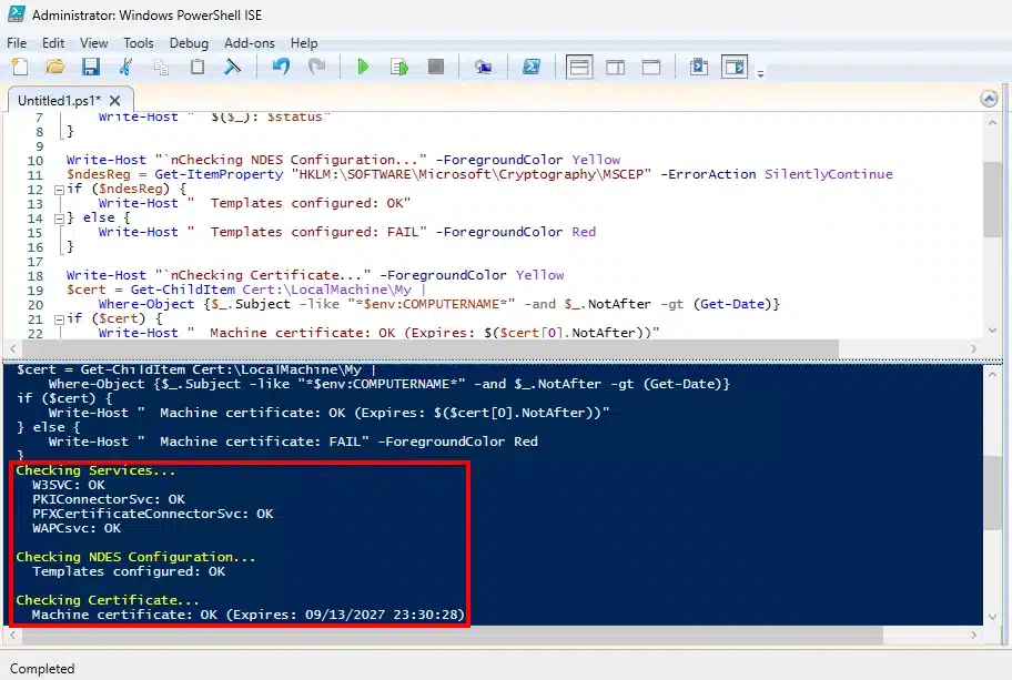 Write-Host " Machine certificate: OK (Expires: $($cert[0].NotAfter))"